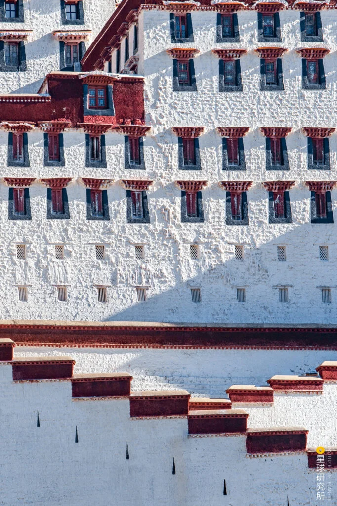 Potala Palace, an emblem of Tibetan heritage, showcases a striking architectural dichotomy between the White Palace and the Red Palace, each distinguished by their unique exterior colors and features. The White Palace walls are painted in a bright white, symbolizing peace and purity, while the Red Palace boasts a rich ocher-red, representing authority and power. The central part of the Red Palace features large vertical windows that span seven floors, creating a sharp contrast with the smaller windows of the White Palace and the narrow ventilation windows throughout the complex. This design choice not only highlights the central structure but also adds a dynamic visual element to the palace’s facade.