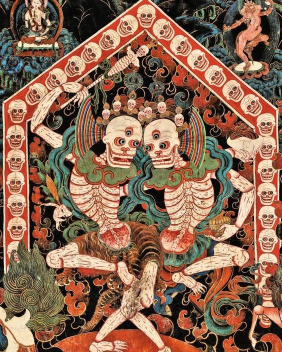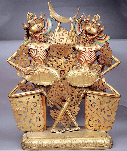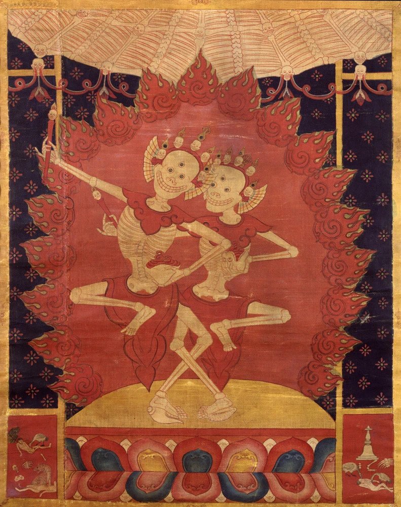 The dance-like postures of these skeletal deities convey deep symbolic meaning: