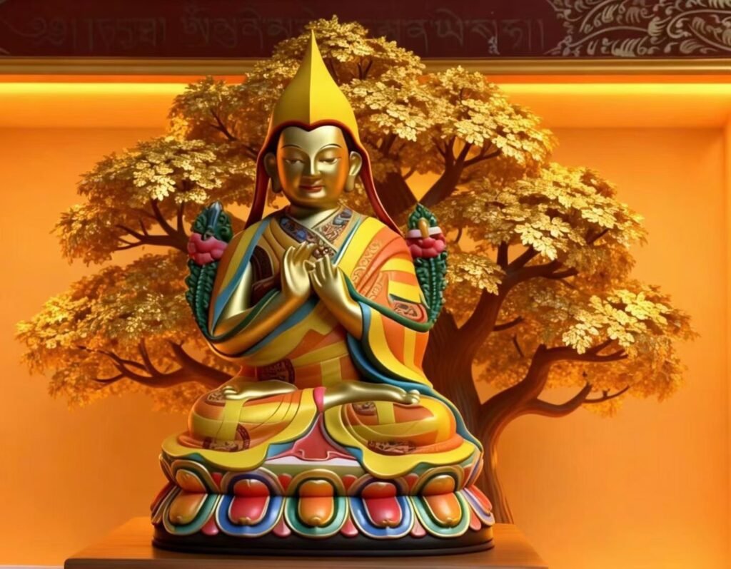 Je Tsongkhapa was born in 1357 in Tsongkha (the location of what is now Kumbum Monastery in present-day Qinghai). He went on to found the Gelug school, one of the four major traditions of Tibetan Buddhism.