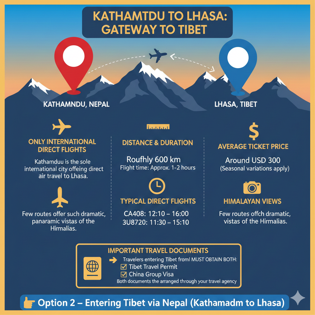 The Kathmandu–Lhasa flight takes about 1.5 hours when operating and is one of the few international routes directly into Tibet.