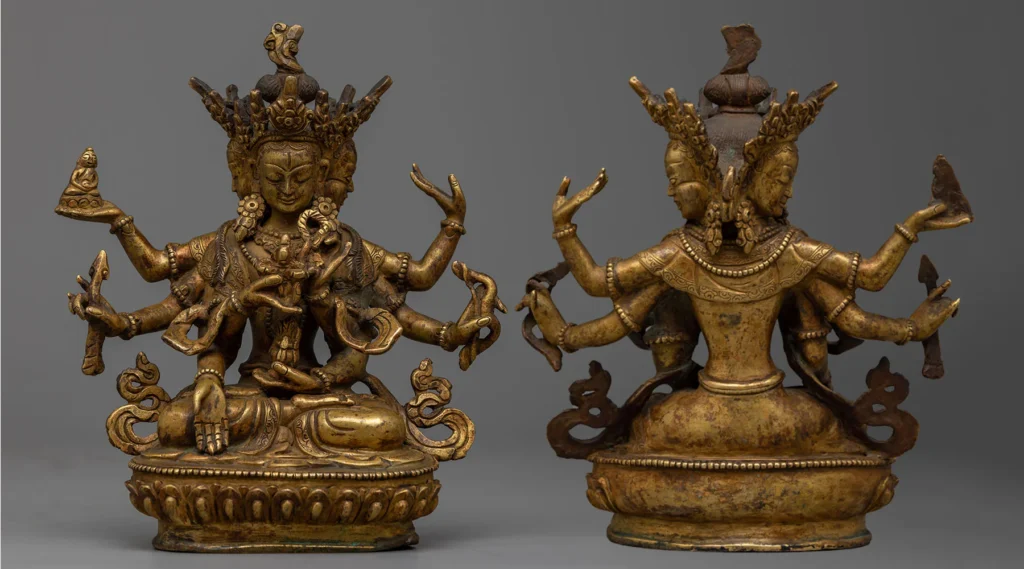Namgyalma’s three faces represent her all-encompassing wisdom and ability to guide beings through diverse circumstances: